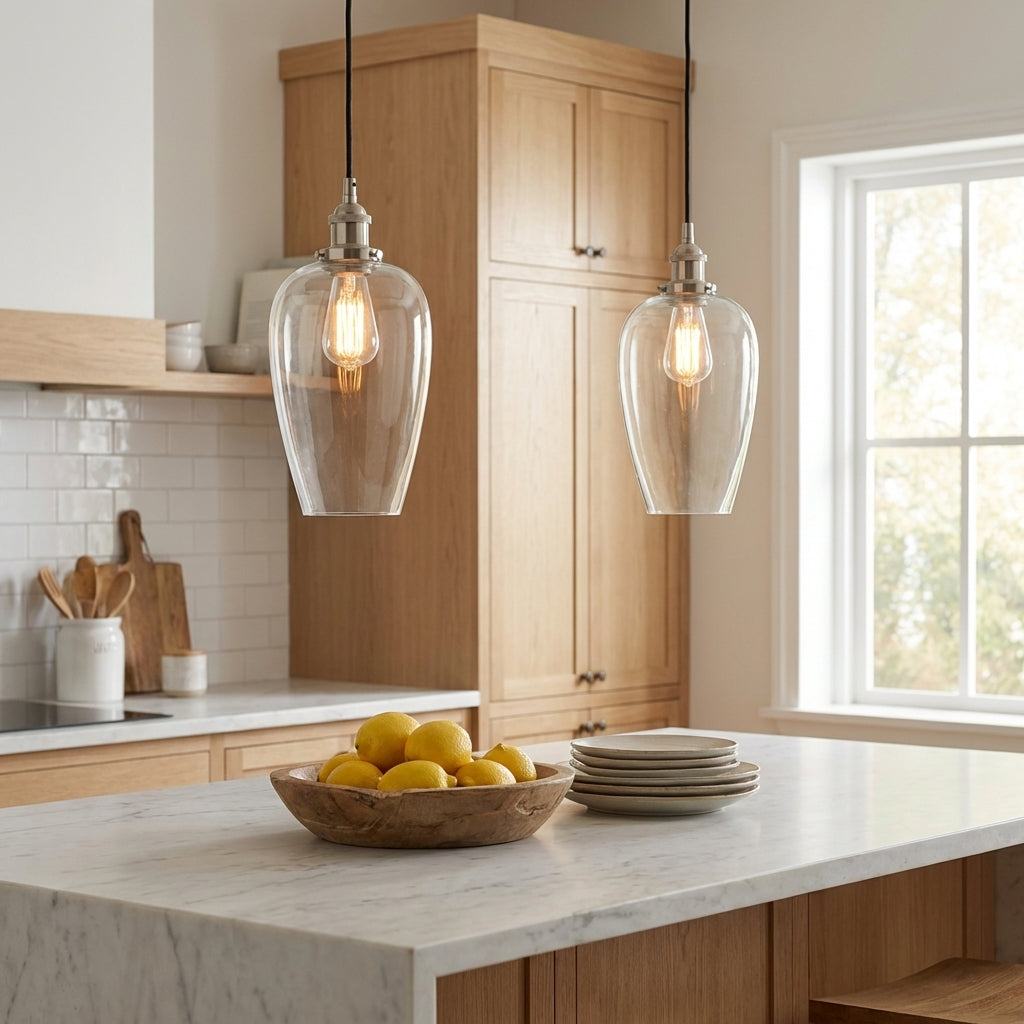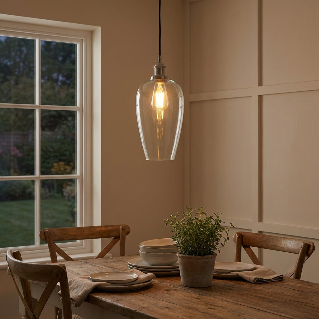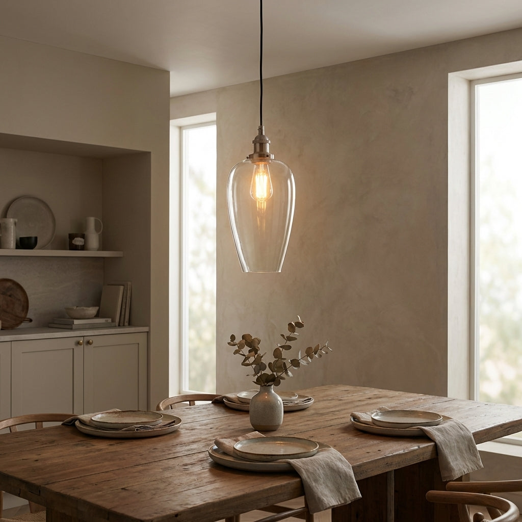 - Clear glass with antique silver fittings and black fabric cable — a combination that simply works