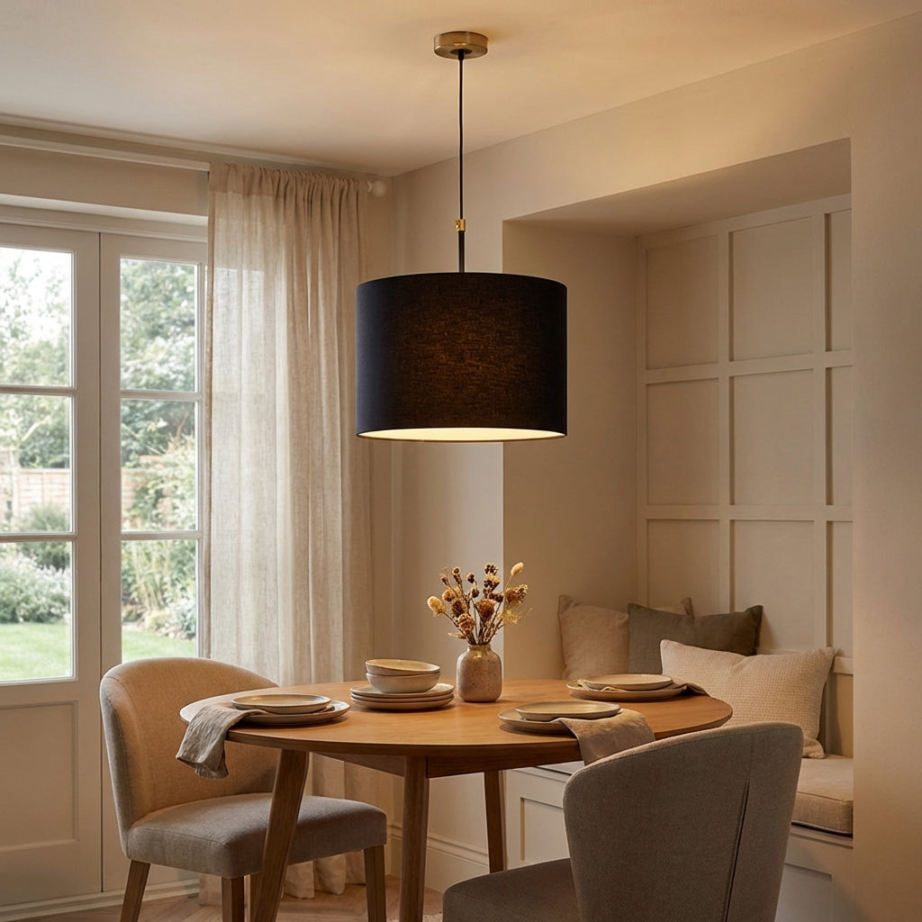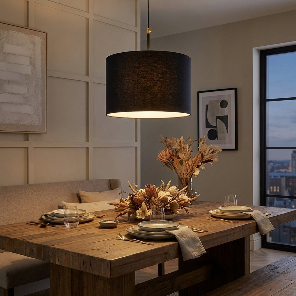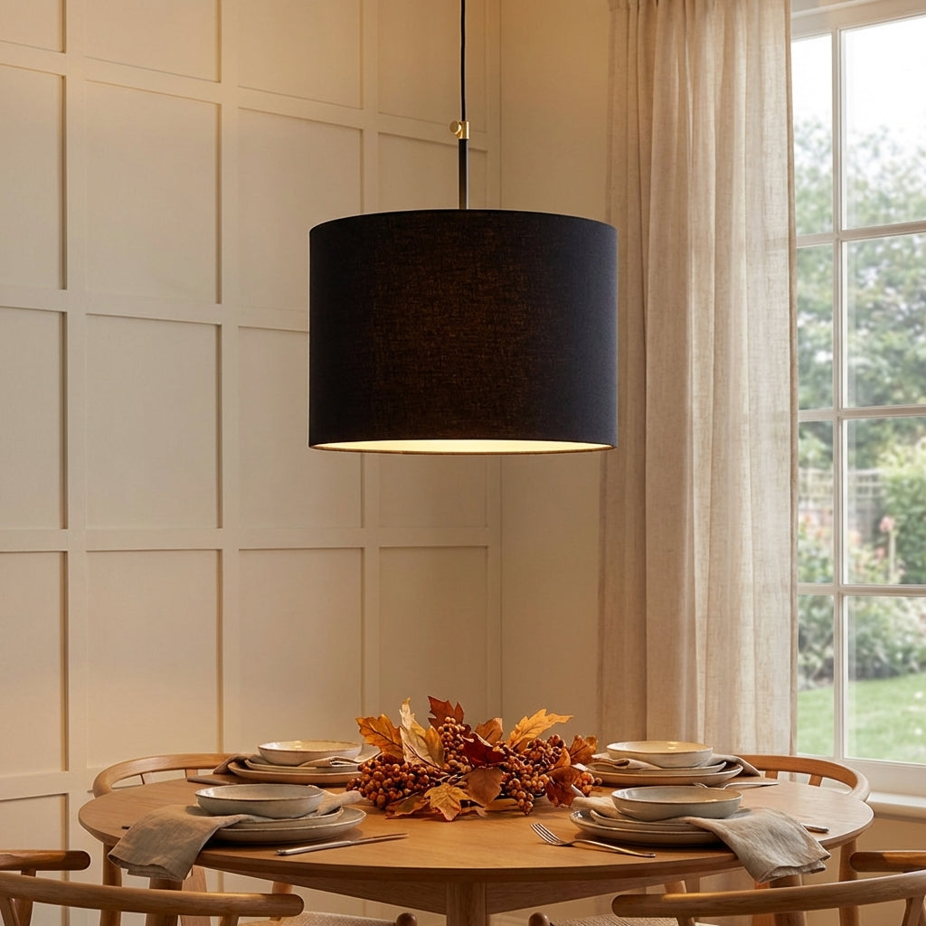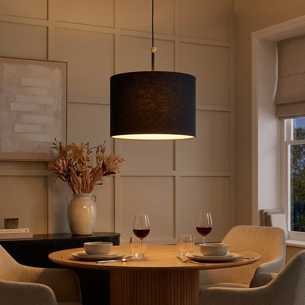 The Eclipse Black & Gold Pendant makes no apologies for itself. A wide black cylindrical shade, a polished gold ceiling plate, a sleek black metal stem with gold accents — it's a combination that is bold, considered and genuinely luxurious. The kind of lighting you see in a high-end hotel or restaurant and immediately want in your own home.