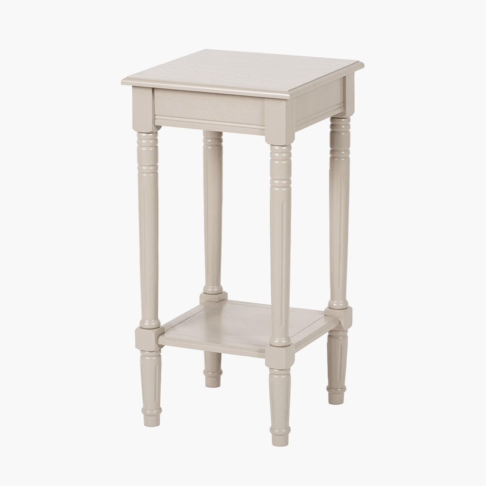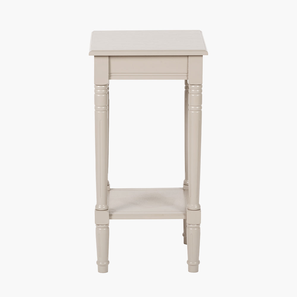 This beautiful square accent table in a putty coloured finish is a design that will stand the test of time. The second shelf offers further storage in classic style.