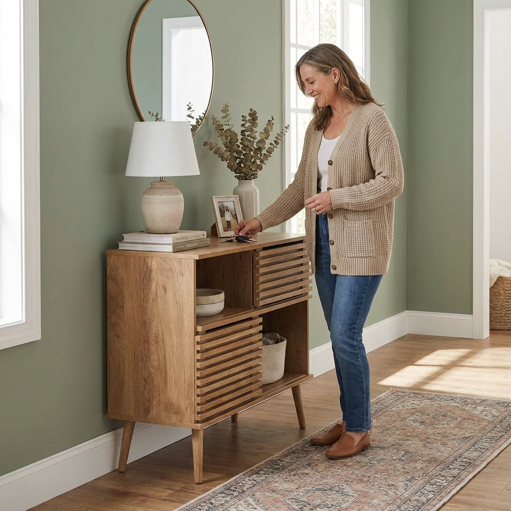 Its proportions work particularly well in Scandinavian-influenced spaces, where texture and practicality are valued as much as appearance. Positioned in a living room, it functions as a compact sideboard; in a dining area, it holds serveware and glassware; in a bedroom, it offers additional storage without visual weight.