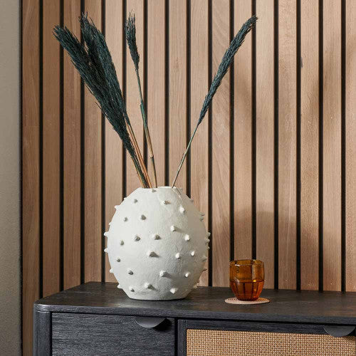 Hand-finished in India this matt White Metal Vase offers contemporary style in abundance. The well-proportioned vase, accentuated with bobbles, is a real textural statement piece that will instantly update your interior.